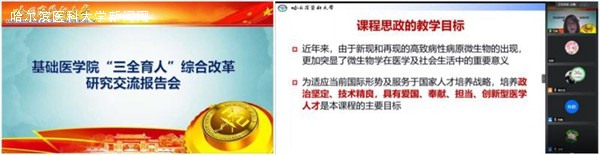 微生物学教研室副主任庄敏以《课程思政在医学微生物学教学中的实施与推广》为主题进行交流报告。庄敏结合微生物学教研室实际工作,从课堂教学中在“知识点”和社会热点、国际形势及国家战略、实验课程等方面积极挖掘和引入课程思政元素,到课堂外通过微信公众号《医学微生物学拓展课堂》、传染病防控知识宣传及开展形式多样的实践活动等,阐述了医学微生物学教研室“三全育人”综合改革情况。