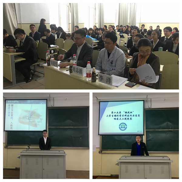 学生工作部副部长牛启超老师主持本次活动,二院风湿免疫科李洋教授、整形美容科肖志波教授以及心内科田进伟教授为本次活动的评委。二院各个年级共有23组选手参赛,其中,科技发明类16组,自然科学类7组。比赛过程中,选手们展示了精心准备的PPT以及所设计发明的模型,所涉及的内容从医疗到生活,从科学研究到技术发明,从实验流程到论文发表,都显示着同学们无限的创新思维和用心思考的历程。选手们的作品激发了其他同学们的创新意识,对促进思维的发散大有裨益。赛后三位评委老师分别对同学们的作品进行逐一点评,对所有的参赛作品高度赞赏,并对参赛选手的创新思维及科研能力表示了肯定,同时教导同学们要脚踏实地,不畏困难,一步一个脚印,一定能够在临床学习和科研中取得成果。