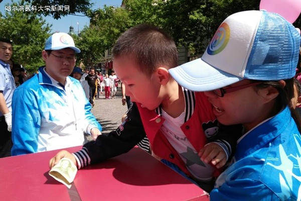 上午9时,扶贫募捐活动正式开始,口腔学生年级志愿者服务队分配的任务是向来中央大街游玩的人们进行募捐活动的宣传以及赠品的搬运与发放。志愿者们分散各处,忍受着酷暑向游客们宣传贫困地区孩子们的现实状况与募捐的必要性,许多家长与孩子们为之动容,纷纷慷慨解囊。1元,2元,5元……几个孩子在家长的帮助下,捐出了手中的100元,他们说:“这100元对于我们来说可能只是陪孩子在外就餐一顿饭的钱,但是对于贫困孩子们来说,这就是两周的伙食费。我现在有能力应当支援这些孩子们,让他们能够享受更好的学习与生活环境。”在场的志愿者与工作人员都被这些家长的大爱所深深打动,这一切的一切,都让我们感受到人间的美好。