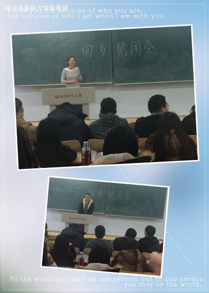 本次回乡见闻会中,同学们表现出了十分认真的态度。大家不仅讲述了寒假里在家乡的见闻,更针对在各自的经历中发现的社会现象提出了自己的见解和深入的思考。例如,大部分同学选择讲述了假期中到临床预见习期间的经历。一位同学说:“在学校我们学习的都是书本上的知识,虽说有些实验活动,但对于我们学生来说,真正动手实践的机会并不多,更别说与患者接触了。作为一名医学生、一名日后担当救死扶伤重任的医生,我们不仅要有一流的理论知识储备,更要通过亲身的实践和体验,才能对这一份工作有着更深入的了解。我预见习时所在的科室中,老师们认真工作的态度给我留下了深刻的印象。在医院里,我看到了生老病死,也看到了许多患者不断地在与病魔缠斗,他们乐观的心情以及积极的意志令我动容。但同时我也认为,病患与医生和医院之间的信任度还是不够,只有二者互相信任互相倚重,在这样的关系之下,所有人才都能安心于治疗。”