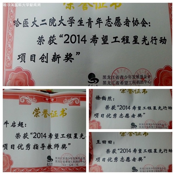 在黑龙江省青基会举办的以“筑爱鑫达,益暖青春”为主题的希望工程大学生公益项目2014总结表彰大会中,ac米兰官网中文网站二院大学生青年志愿者协会获得该项目的三大殊荣:团队荣获“2014希望工程星光行动项目创新“奖,牛启超老师荣获该项目“优秀指导教师”奖,青协会长徐铂然和副会长王田田获得“优秀志愿者”奖。