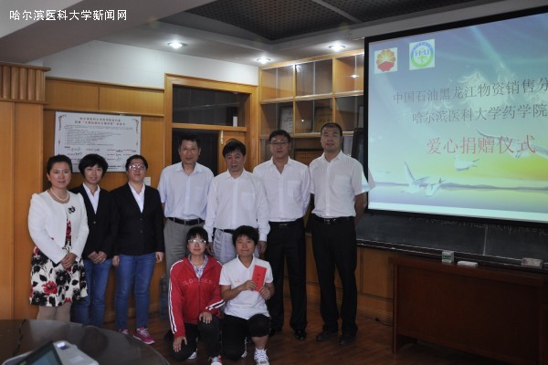 8月28日下午,中石油黑龙江物资销售分公司爱心捐赠仪式在药学院七楼会议室举行,该公司综合办主任周广山及三名员工代表、药学院党委书记李波、学生党总支书记李霞、年级副主任姜大巍参加了捐赠仪式。