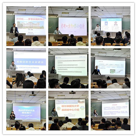 药化教研室王金辉教授、药物分析教研室李洋教授、药剂学教研室唐景玲教授、生药学教研室姚丽教授、临床药学教研室赵丹教授、基因组中心刘慧迪教授、生物制药教研室王爽教授分别讲解不同专业的学科概况、实验室条件、科研方向、科研转化成果以及毕业生去向等内容。专家的讲座诙谐幽默,旁征博引,富有亲和力,老师叮嘱同学们从事科学研究要拓宽视野,从兴趣出发;要明晰就业去向与发展前景,立鸿鹄志,做奋斗者;要珍视母校读研机会,欢迎全体同学积极报考本校研究生,促进母校一流学科建设,助力龙江发展。