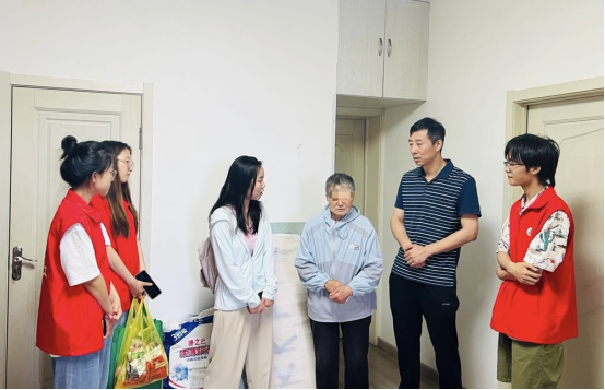 狭小的房间,褪色的衣柜,上面贴着一幅“五福”的儿童画,原本幸福的一家人因癌症陷入困境。如今38岁的女主人乳腺癌骨转移患病卧床,左臂淋巴水肿、被动体位、乳腺伤口溃烂。医院学生党总支书记李迎军仔细地询问了患者的病情和治疗情况,并对患者的精神和心理进行了疏导,鼓励患者和其家人要有一个乐观的精神状态,并代表大家送上了一些生活用品。