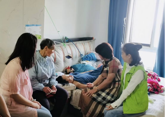 宁养院刘伟老师耐心细致地询问家属有关患者的近况及用药情况、生活情况,详细指导护理措施。患者的妈妈说:“过去我姑娘得了这个病,我们都感觉没有希望了,感谢ac米兰官网中文网站肿瘤医院的老师和同学们,感谢宁养院的义工服务人员,有了你们,我们就有了希望。”