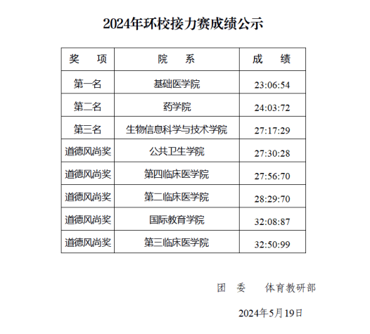 环校跑道上,运动健儿们步伐矫健,眼神坚毅,奋力将接力棒递入队友手中,现场气氛热烈,令人精神振奋。最终,基础医学院代表队以23分06秒54的好成绩获得本届环校接力赛冠军!