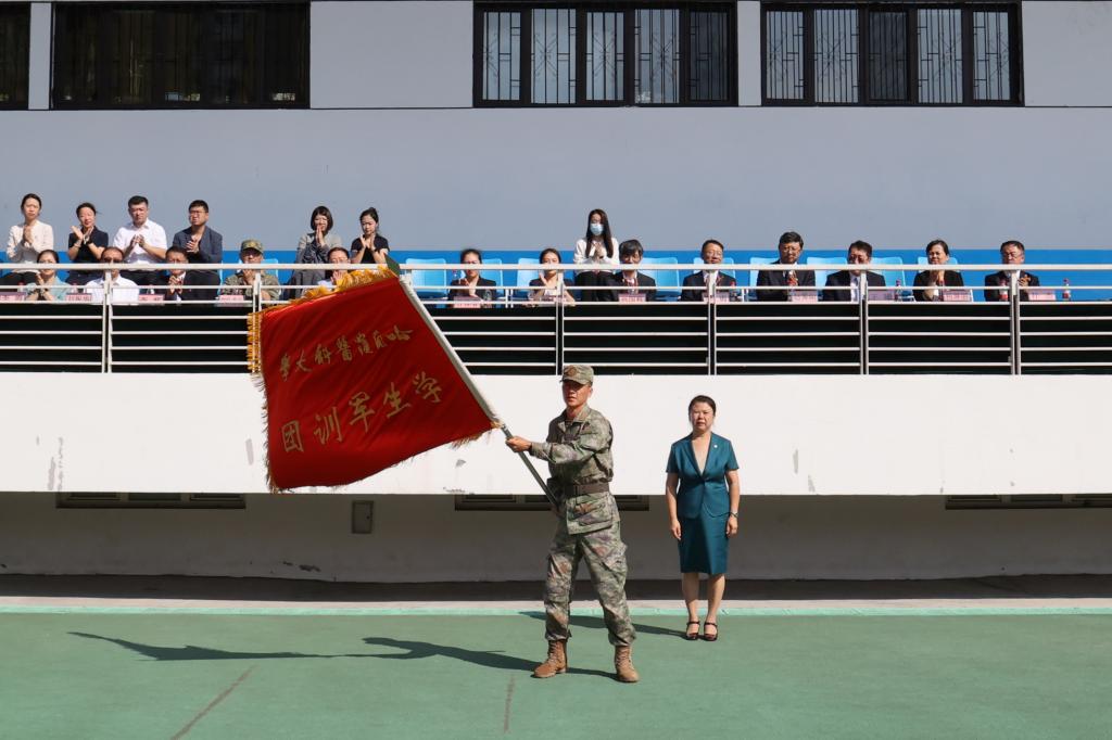 张明宇向承担军训任务的部队教官代表授军训团团旗