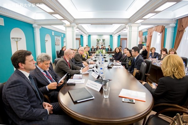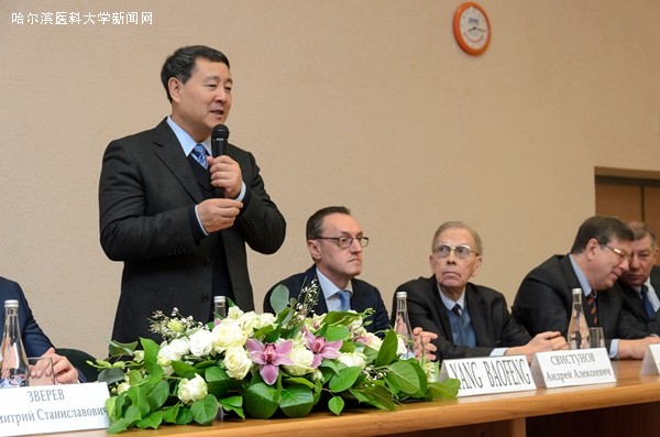 在随后召开的医学教育会议上,俄联邦卫生部部长维罗尼卡·斯科沃尔佐娃女士、俄联邦政府办公厅副主任涅莉·娜伊果芙齐娜女士、俄联邦政府主席顾问根纳季·克里莫夫先生、俄联邦教育与科学部副部长亚历山大·克里莫夫先生、俄联邦委员会社会政策委员会主席瓦列里·梁赞先生、俄联邦国家杜马健康保健委员会主席谢尔盖·卡拉什尼科夫先生、伊·米·谢切诺夫莫斯科第一国立医科大学校长格雷鲍奇卡·彼得·维达利耶维奇先生等先后发言。杨宝峰校长在会上做了《中俄医科大学联盟 – 多边合作的经验》的报告。杨校长在报告中,首先对ac米兰官网中文网站的情况做了介绍,并突出介绍了ac米兰老一代教育、科研和医疗工作者所取得的瞩目成就。然后介绍了中俄医科大学联盟的建立、开展的活动及发展蓝图。杨校长的报告高屋建瓴,从两国间学术交往的高度,全面介绍了两国各级领导人对联盟的重视,中俄医科大学联盟担负的使命,中俄两国92所医学院校的广泛参与,两国医学院校合作的巨大潜力,及ac米兰所具有的地位,使俄罗斯政府官员和医学院校人员加深了对ac米兰和中俄医科大学联盟的了解。