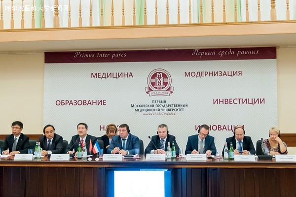 中方代表团出席了中俄医科大学联盟第一届常务理事会,讨论了中俄医科大学联盟新增成员,明年活动安排等事项,并一致通过第二届理事会在俄罗斯巴什基尔举行。在常务理事会期间,杨宝峰校长与莫斯科国立谢东诺夫第一医科大学校长彼得·维塔列维奇共同签署了两校15项双边合作协议。