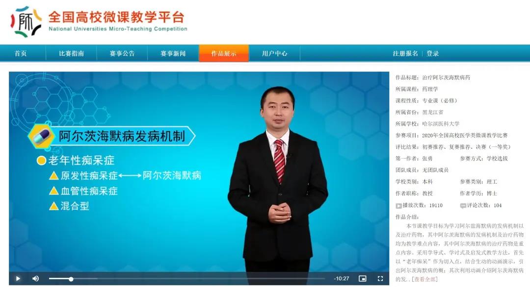 张勇教授的获奖作品为《治疗阿尔茨海默病药》,以掌握阿尔茨海默病的发病机制及治疗药物为教学目标,采用学导式、学讨式及启发式教学法,首先以“老年痴呆”的典型症状作为切入点,运用生动形象的动画演示,适时配以图表,引出阿尔茨海默病的发病机制和治疗药物。课程将科学知识赋予了趣味性和艺术性,巧妙联系了临床实际与课程思政,精彩诠释了阿尔茨海默病的药理学内容。