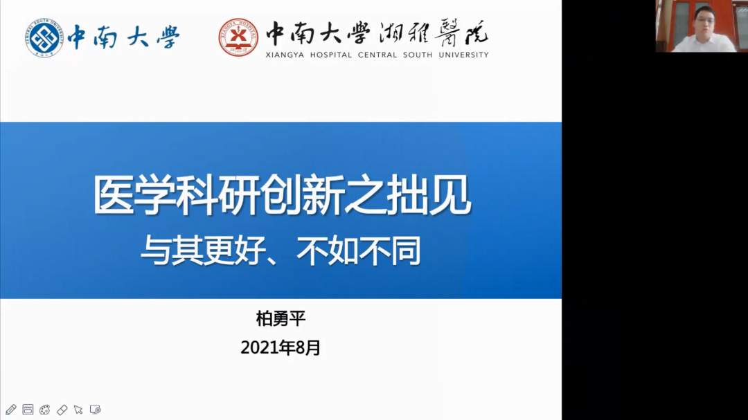 中南大学柏勇平教授以《医学创新之拙见——与其更好,不如不同》为题,围绕“创新”提出了自己的理解,他提出了差异化竞争+第一性原理,并结合自己的三个探索性发现,启发学生通过表象挖掘更深层次的研究意义,与众不同,发现问题,解决问题。