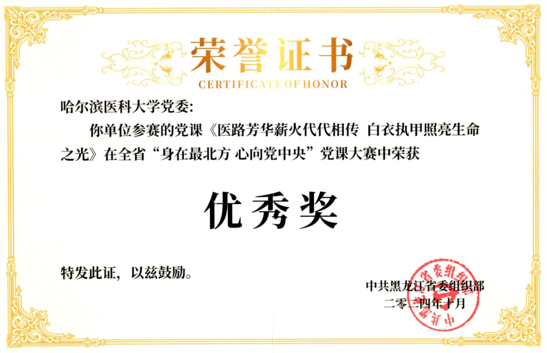 2024年11月,学校党委在黑龙江省“身在最北方 心向党中央”党课大赛中主讲的《医路芳华薪火代代相传 白衣执甲照亮生命之光》主题党课,荣获高校专场“二等奖”和全省“优秀奖”。