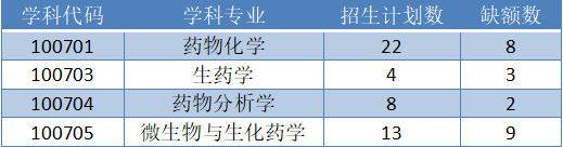 根据学校复试方案,各学科考生将按总成绩(总成绩=初试总分+复试总分)由高到低排名,排名在招生计划之内者作为拟录取生源报学校审批。药学院各学科(研究方向)招生计划数和缺额情况如下,由于招生过程存在一定的动态变化,我院缺额情况也将随之持续更新。正式接收调剂的学科专业及缺额数,请考生以中国研究生招生信息网调剂系统中开通的学科专业为准: