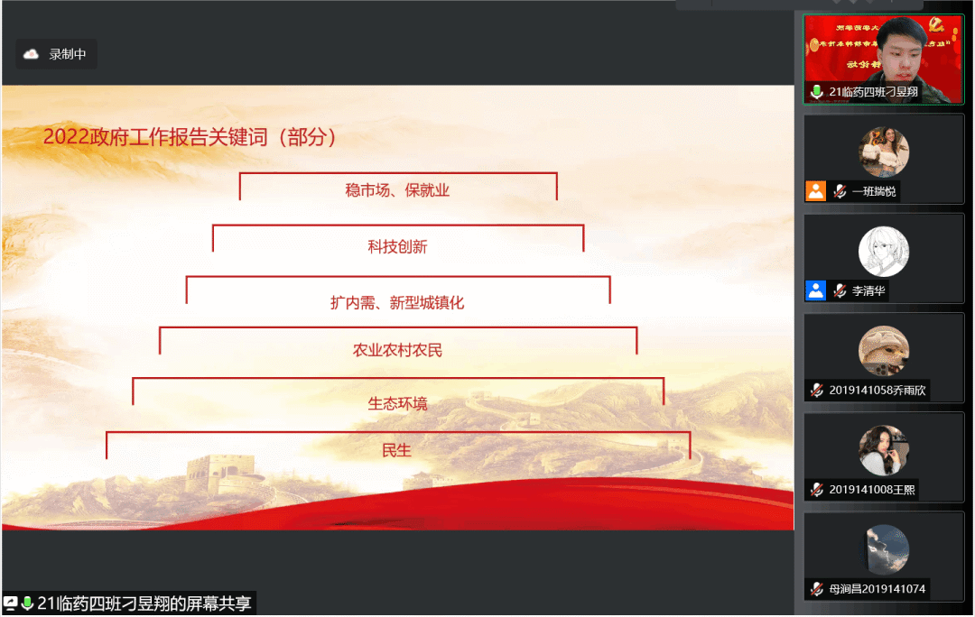 紧接着,21级临床药学的刁昱翔同学针对“2022年全国两会”内容做专题汇报。他总结到,2021年,在中国共产党的领导下,在无数中国劳动人民的奋斗下,我们如期打赢了艰难而漫长的脱贫攻坚战;我们如期全面建成了小康社会;我们在一次次的实践与反思中实现了第一个百年奋斗目标。2022年,我们将用更加百折不挠的勇气与汗水向第二个百年新征程进军。在刁昱翔的清晰讲解中,2022年的政府目标和政策方向逐渐明晰。他呼吁全体同学们要胸怀澎湃的爱国热情和强烈的社会责任感,积极提升自身能力,为祖国的现代化建设储备青春力量。