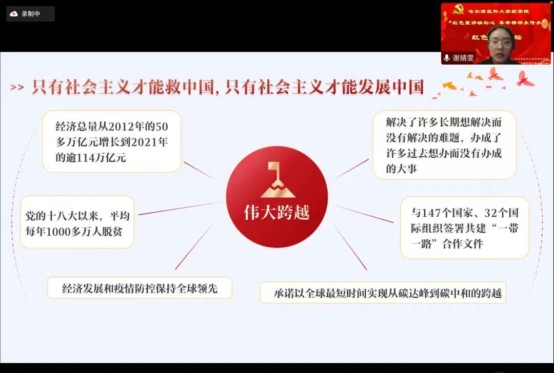 最后,21级药学的谢靖雯同学开展宣讲。她带领同学们进一步了解中国共产党领导中国的重要性,中国走社会主义道路的必要性以及中国青年人锤炼自身品德、弘扬爱国主义的关键性。她从中国社会经济政治状况、时代条件和国际环境的新特点以及中国革命的领导力量三个方面详细分析了中国走社会主义道路的原因。最后,她向全体同学们发出呼吁:梦在前方,路在脚下;征途漫漫,惟有奋斗。青年一代有理想、有担当,国家才有前途,民族才有希望。