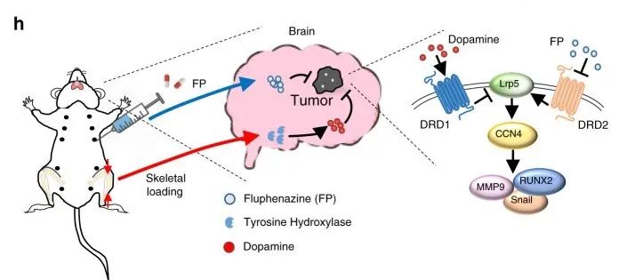 众所周知,骨骼所受机械负荷可促进骨内环境稳定和抑制肿瘤诱导的骨溶解。然而,负重的后肢是否对远端肿瘤的生长造成影响仍不得而知。我们通过研究肿瘤细胞对Lrp5介导的WNT信号和多巴胺的反应,探讨了骨-脑机械转导的可能性。结果显示,在胫骨施加机械刺激后可增加脑内多巴胺合成限速酶-酪氨酸羟化酶的表达,并且显著减少脑肿瘤的进展。同时,应用巴胺调节剂氟非那嗪(FP),可增强对脑肿瘤抑制作用。多巴胺和FP分别通过多巴胺受体DRD1和DRD2发挥抗肿瘤作用。细胞因子阵列分析显示,CCN4的下调对于多巴胺介导的肿瘤抑制至关重要。Lrp5的沉默降低了CCN4的表达,从而抑制其下游致癌基因的表达,如MMP9、Runx2和Snail。综上所述,本研究证明,远端机械负荷可通过神经信号,抑制大脑中Lrp5-CCN4通路,调节多巴胺能信号,抑制脑肿瘤的发生发展,将物理治疗以及药物治疗相结合,有可能发展成为一种乳腺癌脑转移的治疗手段。