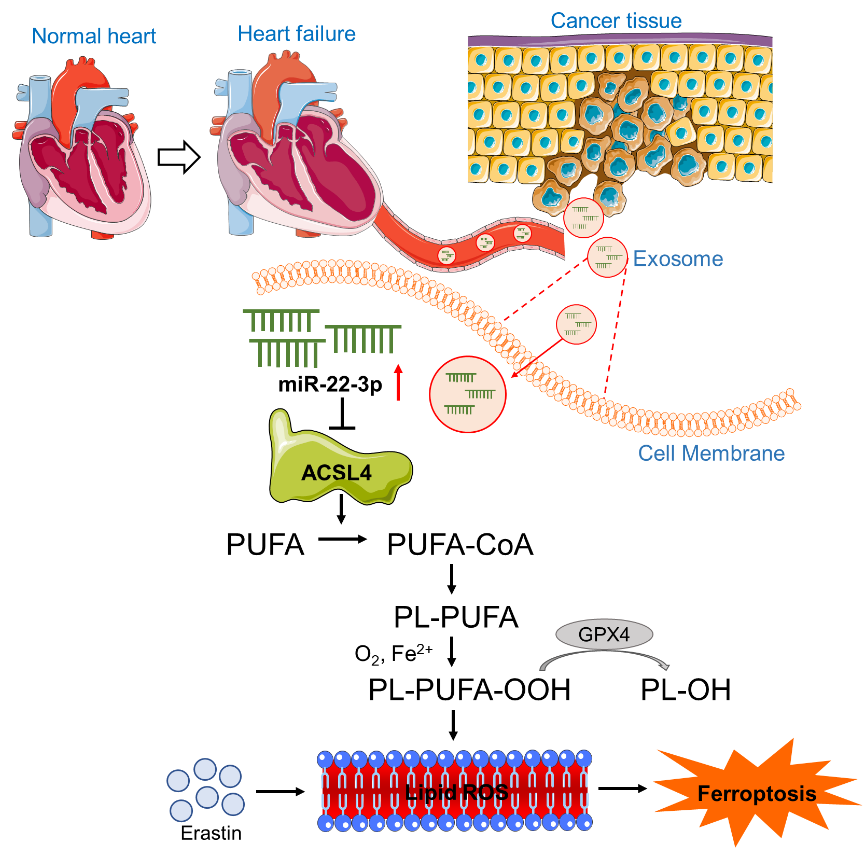 杨宝峰院士团队发现HF降低肿瘤对铁死亡诱导剂的敏感性,进而阻断后者对肿瘤生长的抑制作用。进一步研究证实这一作用是由HF小鼠血浆外泌体所介导。机制研究发现,心肌细胞释放的外泌体携带miR-22-3p转移至远端的肿瘤组织中,通过靶向抑制ASCL4抑制肿瘤细胞铁死亡。心肌细胞特异性沉默miR-22-3p部分消除上述作用。该研究首次揭示了缺血性心衰通过外泌体递送系统调控肿瘤对铁死亡诱导剂敏感性的作用及机制,提高了我们对心脏病与肿瘤交叉研究领域的新认识,为基于“心脏-肿瘤轴”的靶向治疗提供新思路。