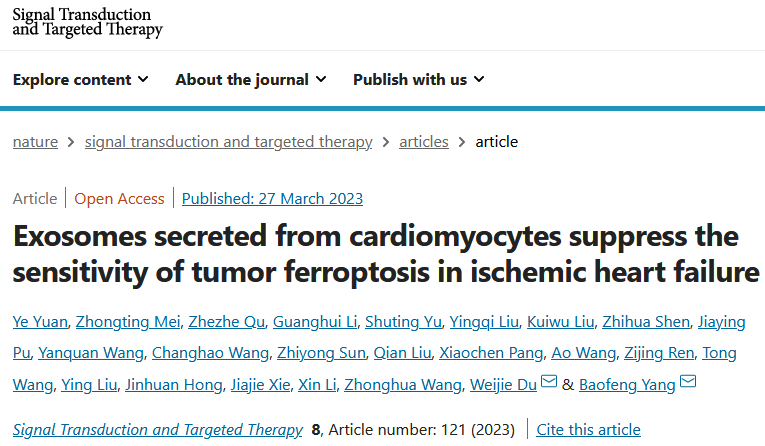 我院杨宝峰院士团队在心脏病学与肿瘤学交叉研究领域取得新进展,研究成果论文《Exosomes secreted from cardiomyocytes suppress the sensitivity of tumor ferroptosis in ischemic heart failure》于2023年3月27日发表于高水平期刊《Signal Transduction and Targeted Therapy》(IF:38.104)。本研究首次发现外泌体介导心脏和肿瘤病理信号传递的作用及分子调控机制。