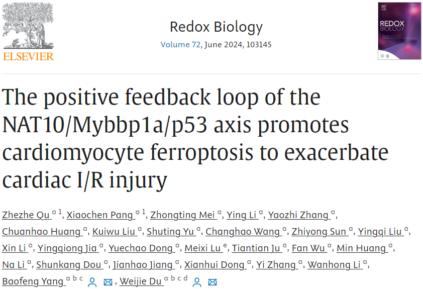 我院杨宝峰院士团队在心肌缺血再灌注损伤领域取得新进展,研究成果论文《The positive feedback loop of the NAT10/Mybbp1a/p53 axis promotes cardiomyocyte ferroptosis to exacerbate cardiac I/R injury》于2024年4月2日发表于《Redox Biology》(IF: 11.4)。该研究首次发现并阐明NAT10诱导心肌细胞铁死亡促进心脏I/R损伤的潜在分子机制,为缺血性心脏病的临床防治提供了新思路与治疗靶点。