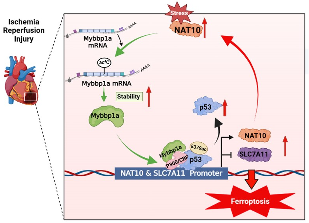 杨宝峰院士团队首次发现心脏I/R时表达上调的NAT10通过介导Mybbp1a mRNA ac4C修饰增加其稳定性,进而促进P53乙酰化并增强其转录活性,降低铁死亡抑制因子SLC7A11表达,从而诱导心肌细胞铁死亡加重心脏I/R损伤。反之,心肌细胞特异性敲除NAT10或给予特异性抑制Remodelin通过减轻心肌细胞铁死亡发挥心肌保护作用。进一步研究揭示P53作为转录激活因子促进NAT10表达。该研究首次揭示了NAT10/Mybbp1a/P53正反馈环路在心脏I/R损伤的作用机制,为缺血性心脏病防治提供新策略。