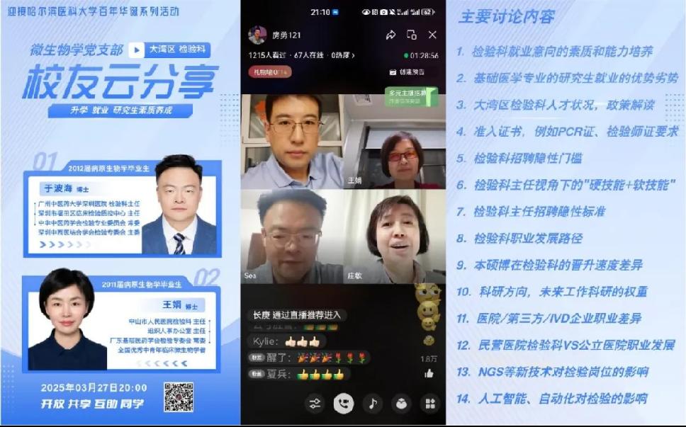 本次活动邀请广州中医药大学深圳医院检验科主任于波海(2012届博士校友)和中山市人民医院检验科主任王娟(2011届博士校友)担任主讲嘉宾,同时得到12位各地各级医疗机构检验科主任的在线支持。活动吸引100余名硕士、博士及基础长学制学生线上参与,直播间互动弹幕超500条,观看量达1200余次,获1.8万多次点赞,取得良好的社会反响。