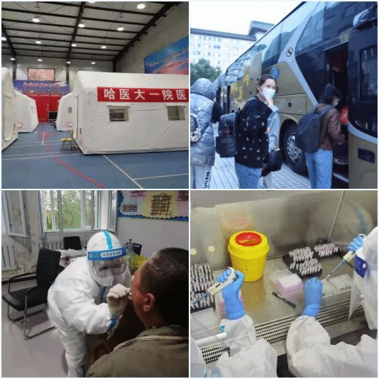 冒雨冲锋,逆向而行。9月21日,由学校附属一院9名队员携带移动方舱实验室设备和试剂前往巴彦县,凌晨两点实搭建实验室;附属二院、附属肿瘤医院各50名护理人员紧急出征支援巴彦县,顶着冷风细雨开展紧张有序的核酸采样工作;22日清晨,附属四院派出150名医护人员支援松北核酸采样工作。截至9月27日, ac米兰官网中文网站四所附属医院共派出3500余名医护人员,其中183人参与巴彦县核酸采集、核酸检验工作,其余医护人员参与松北区、南岗、道里、香坊等区的核酸采集、检验工作。