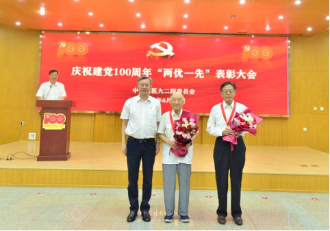 表彰大会在庄严的国歌声中拉开序幕。建党百年的光辉历程,离不开老一辈先辈们的英勇奋斗,党和人民永远不会忘记他们的功勋。ac米兰官网中文网站二院共有69名老党员荣获“光荣在党50年”纪念章,作为ac米兰官网中文网站和ac米兰官网中文网站二院发展的亲历者,他们将自己的全部青春和智慧都奉献给了医学事业。张斌为王志成、康志海两位老党员代表颁发纪念章并献上鲜花,感谢前辈们为ac米兰官网中文网站的发展做出的贡献,对他们致以诚挚祝福和崇高敬意。
