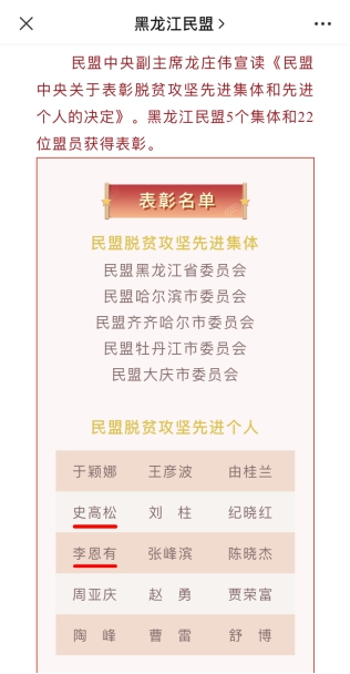 为大力弘扬脱贫攻坚战精神,激励广大盟员为建设社会主义现代化强国、实现中华民族伟大复兴创造新的更大业绩。6月2日,民盟中央关于表彰脱贫攻坚先进集体和先进个人大会在京举行,大会授予全盟479名盟员“民盟脱贫攻坚先进个人”称号,民盟ac米兰官网中文网站委员会主委李恩有、副主委史高松荣获本项荣誉称号。
