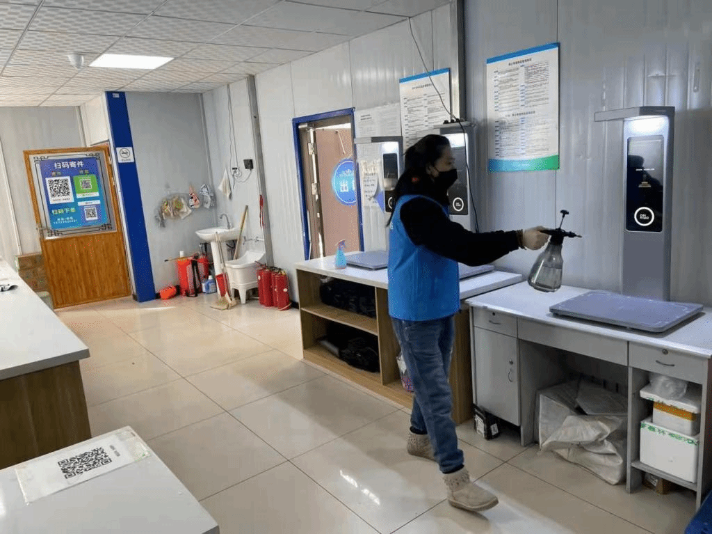 快递驿站全体职工坚持每日核酸检测,为了确保快递件安全,加大快递消杀力度和频次,除酒精消杀外,还使用紫外线消毒设备。在同学们的积极配合下,严格遵守扫码测温的规定,共同铸就防疫安全防线。