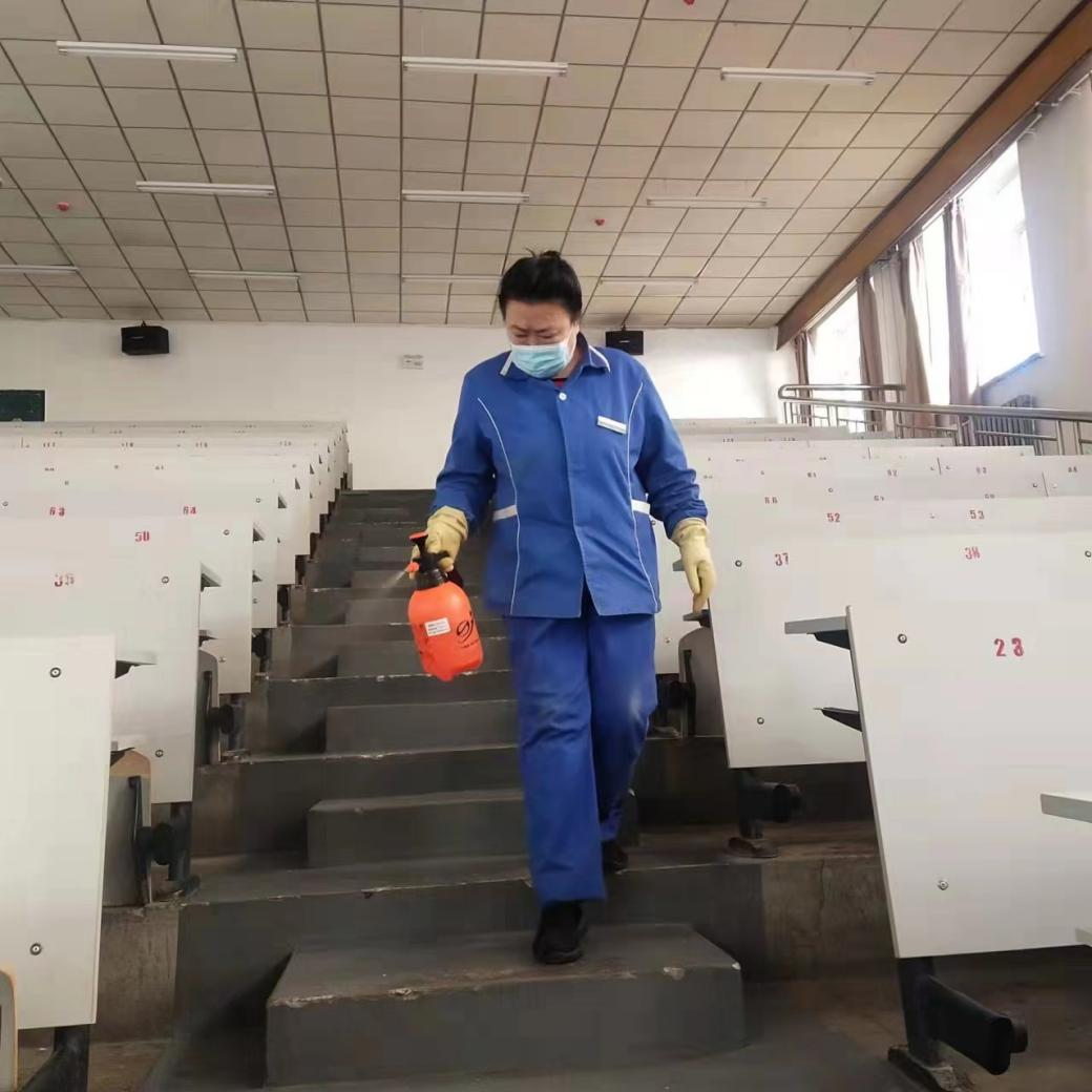 迎着朝阳,目送晚霞,校园管理科用心守护着校园的环境卫生,全天通风,每日进行三次消杀,从公共区域到室内环境,他们在公寓楼中与同学们朝夕相处,为了“无疫校园”的共同目标,默默努力。