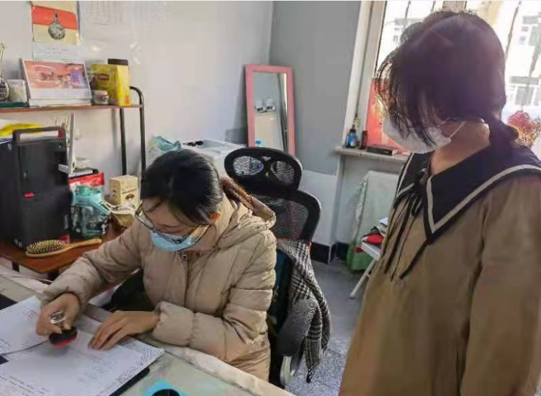 公寓辅导员王雪琪、郭怡枫核对核酸检测学生名单