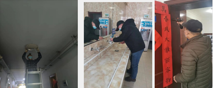 学生处公寓管理中心的工人师傅维修学生公寓的照明灯、水房龙头和宿舍门