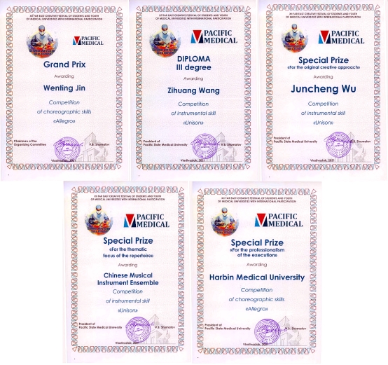 ac米兰共选派5个节目参加本届艺术节,经俄方专家评议与网络评选,ac米兰2020级“5+3”临床医学专业金文婷同学表演的独舞“和离书”,衣袂飘飘,翩跹飞舞,获得了特等奖;2021级临床药学专业王孜煌同学的葫芦丝独奏“月光下的凤尾竹”获得三等奖;其他节目也表现不俗,分别获得了单项奖。