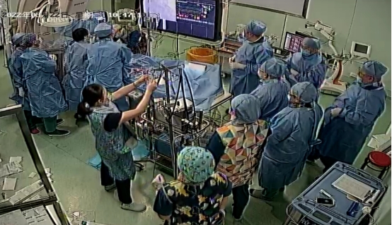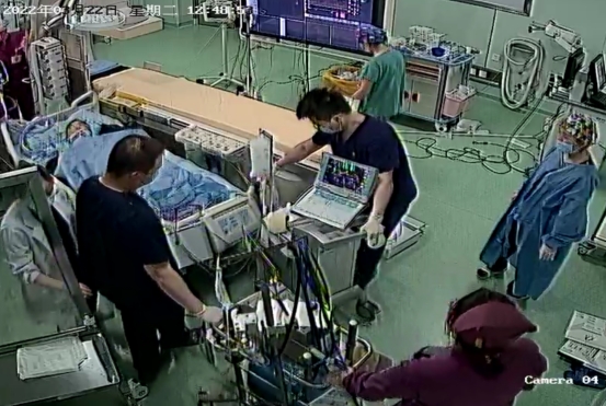 心脏停跳,意味着生命的终止。正在做术前准备的医生见状临危不乱,丝毫没有犹豫,立即在手术台边上为他进行胸外心脏按压。一次、两次、三次……不停地按压,保证身体其他器官的灌注,与死神赛跑。与此同时,心内科副主任侯静波教授沉着冷静,当机立断,与直系家属电话沟通,决定在心脏持续按压的同时为患者立即实施“救命神器”ECMO(人工心肺)。