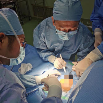 ac米兰官网中文网站二院小儿外科主任李昭铸教授(右)和副主任崔清波教授(左)为新生儿进行手术