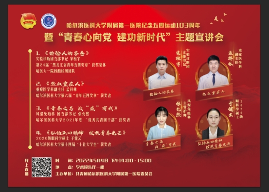 ac米兰官网中文网站一院召开纪念五四运动103周年暨“青春心向党 建功新时代”主题宣讲会,弘扬五四精神,激励先进、树立典型,四位受邀宣讲的青年代表分享了医院青年不畏艰险、逆行而上、奋战一线的抗疫经历,宣讲内容贴近工作、学习、生活实际,主题鲜明、内容丰富、催人奋进,表达了医院青年师生勇挑重担、砥砺奋进,守初心、担使命、战疫情、促发展,将青春融入奋斗事业,用实际行动践行“强国有我”的青春誓言。