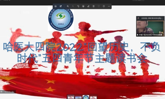 第四临床医学院举办五四青年节主题读书会。学生自行选择相关书籍阅读,通过各支部内部评选,由10名优秀学生代表在线上分享自己的学习心得和读书体会。此次读书会在全院进一步营造了爱读书、读好书、善读书的氛围,为疫情防控下通过阅读引导全院学生提升思想境界,增强精神力量,建设书香校园,提供了一次良好的示范。