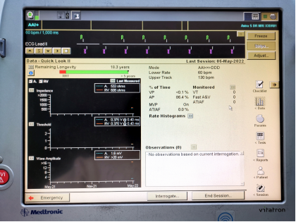 此外,39岁刘先生因患有先天性心脏病,最近出现头晕,自测心率只有30多次,被诊断为三度房室传导阻滞。因为患者比较年轻,需要选择长寿命的起搏器,所以也植入了3.0TMRI兼容心脏起搏器,起搏器的预估寿命可达到18年左右。