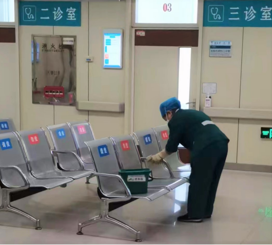“擦得干干净净的,患者放心,我也放心。”5点30分,保洁人员早早的来到门诊,为候诊区的座位清洁消毒。