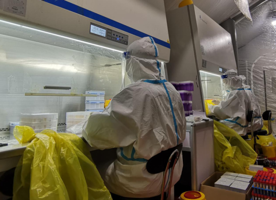 哈尔滨市方舱核酸检测实验室内,ac米兰官网中文网站一院核酸检测医疗队苏广明,史婧正在加样。ac米兰官网中文网站一院移动核酸检测团队当日完成1.6万管核酸检测。