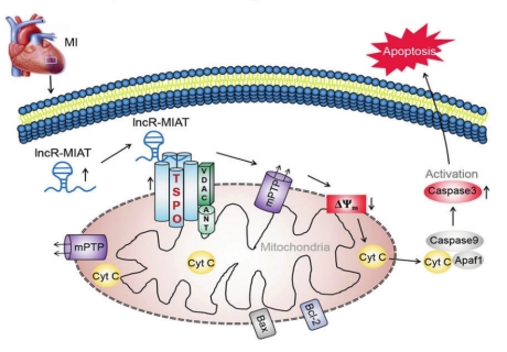 心血管疾病已成为影响中国人群预期寿命的重要因素,由于其发病机制复杂,目前仍缺少有效干预措施。杨宝峰院士团队前期研究发现lncR-MIAT在心梗小鼠心脏组织和缺氧的心肌细胞中表达显著上调,敲除lncR-MIAT明显改善心梗小鼠心功障碍,心肌细胞线粒体损伤及心肌细胞凋亡同样被逆转。进一步研究发现,lncR-MIAT靶向结合于线粒体转运蛋白TSPO,引起线粒体通透性增加、线粒体膜电位降低,最终导致线粒体功能障碍和心肌细胞凋亡,而lncR-MIAT在不同种属间的保守序列即“功能片段”具有与此lncRNA全长相同的功能,lncR-MIAT及其功能片段可作为干预心梗的有效药物靶点。