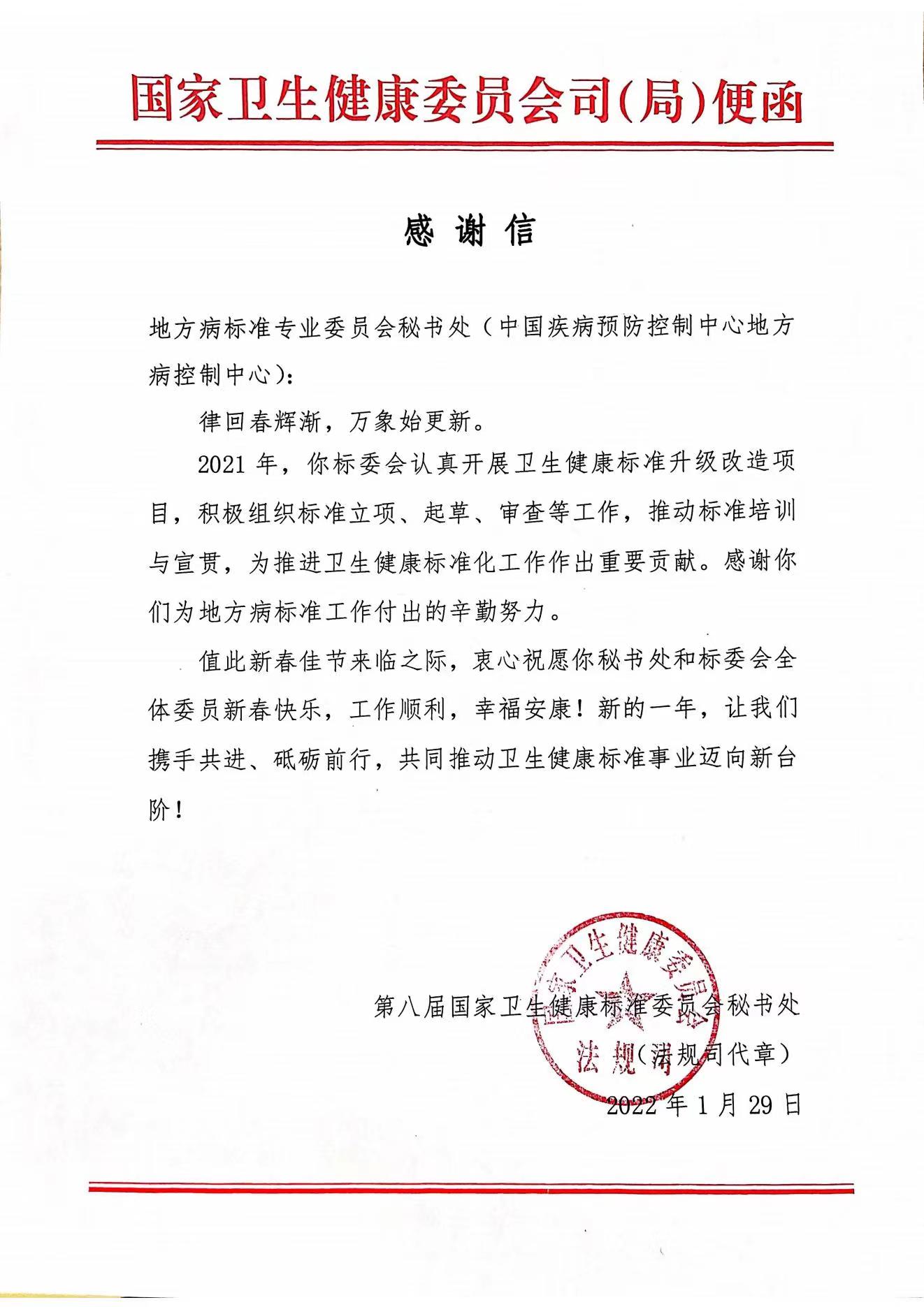 岁末年初,中国疾病预防控制中心地方病控制中心(简称地病中心)收到国家卫生健康标准委员会秘书处感谢信。信中对挂靠地病中心的国家地方病标准专业委员会在2021年度开展的系列工作给予了高度肯定,并感谢秘书处为地方病标准工作付出的辛勤努力。