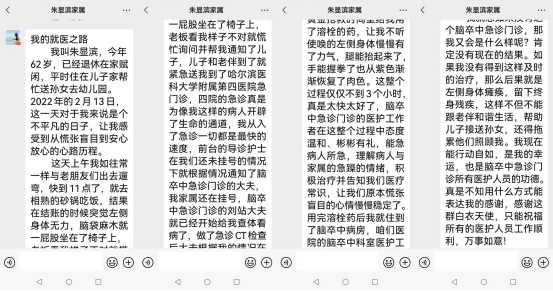 患者从进入急诊到静脉溶栓时间不到30分钟,脑卒中溶栓团队的每一位医护人员动作迅速,充分为患者病情抢出了时间。目前患者恢复如初,正常接送孙女上、下学,家人也都非常高兴。朱大爷十分感谢所有医护人员并写了感谢信:“溶栓治疗让我获得了第二次生命!”