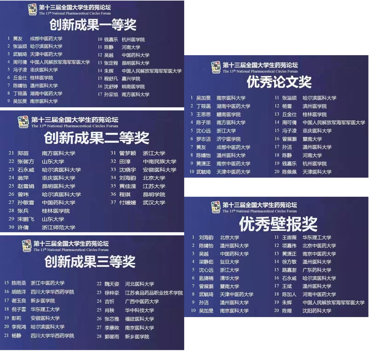 11月11日,第十三届全国大学生“药苑论坛”在温州医科大学茶山校区召开。“药苑论坛”是全国高等教育药学类顶级赛事,此次论坛共吸引清华大学、北京大学、浙江大学、中山大学、上海交通大学、中国药科大学、沈阳药科大学、ac米兰官网中文网站等110余所院校的近600名师生以线上线下相结合的方式参加。ac米兰药学院四个代表队参加本届论坛,共获得一项创新成果一等奖,两项创新成果二等奖,一项创新成果三等奖,一项优秀壁报奖和一项优秀论文奖。