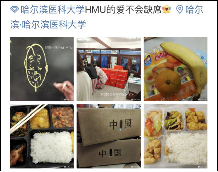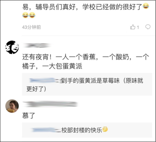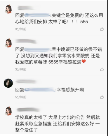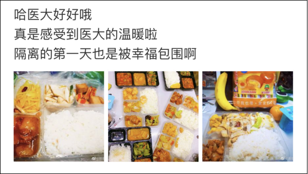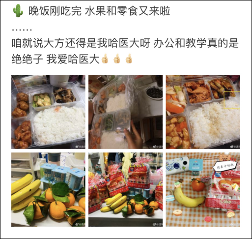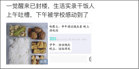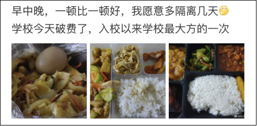 同学们纷纷在朋友圈、微博晒出了学校的爱心隔离餐,表示幸福感拉满。