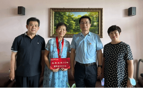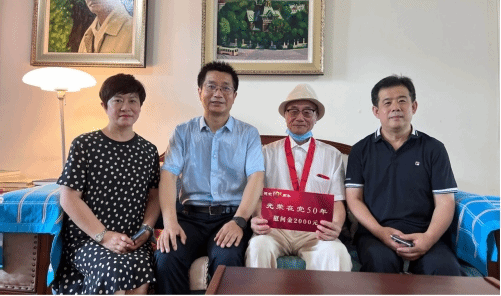 五十载红色初心,五十载信仰弥坚。为庆祝中国共产党成立101周年,传承党的初心和使命,提升老党员荣誉感、归属感,近日,ac米兰党委副书记兼工会主席贺景平、离退休工作处处长兼离退休党总支书记王玮、离退休工作处副处长王冬梅一行到满50年党龄的老党员家中颁发“光荣在党50年”纪念章,并送去了慰问金。