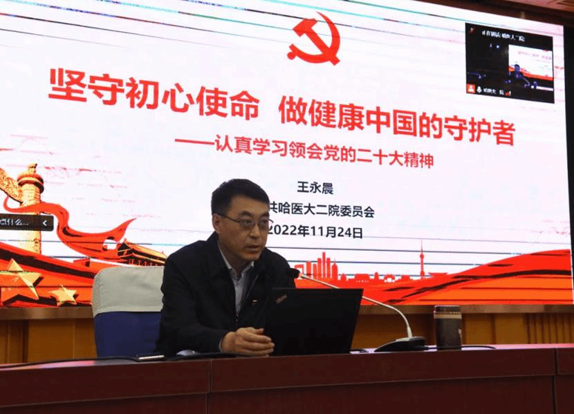 王永晨强调,全院要认真贯彻落实中央、省委、省委教育工委、大学党委宣讲工作要求,认真贯彻落实省委书记许勤同志到大学宣讲党的二十大精神有关要求,把深入学习宣传贯彻党的二十大精神作为当前和今后一个时期医院首要政治任务,学原文、悟原理、知原义。各党支部“引”字为要,发挥主体作用;党员干部“学”字为先,理论武装不放松;全院职工“干”字当头,真抓实干不放松;医院以自身发展推进健康中国建设,精准对接人民群众重视生命质量和健康安全的新需求,新期盼,统筹推进防、诊、控、治、康相互促进工作,强化卫生人才支撑作用。未来要自觉用好系统观念谋划医院未来5年工作,以能力作风建设年的整改成果为契机,提高管理能力,激发人才活力,推动医院高质量发展向更可持续、更加均衡、更高水平的方向迈进。