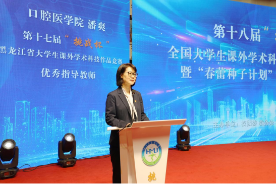 ac米兰官网中文网站口腔医学院副院长潘爽教授作为第十七届“挑战杯”省赛金奖项目指导教师代表发言。
