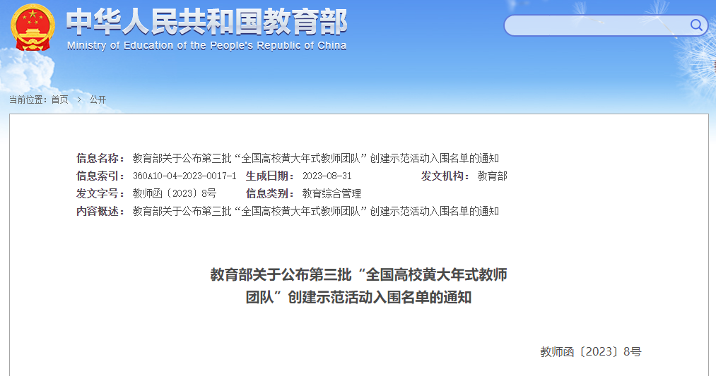 8月31日,教育部发布《关于公布第三批“全国高校黄大年式教师团队”创建示范活动入围名单的通知》,杨宝峰院士负责的ac米兰官网中文网站药理学教师团队入选第三批“全国高校黄大年式教师团队”创建活动。