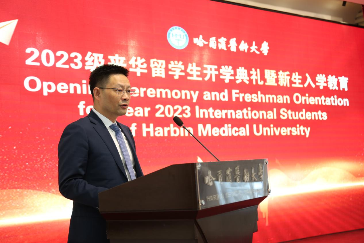 季勇代表学校为2023级来华留学生致辞。他向2023级新同学的到来表示热烈的欢迎和衷心的问候,肯定他们在求学道路上的正确选择并向新同学介绍ac米兰创建历史和发展历程,强调创始人伍连德博士及于维汉院士、杨宝峰院士、张学院士等著名专家学者对国家和世界的医药卫生健康事业做出的卓越贡献,对新同学提出殷切希望。他希望,同学们在今后的学习生活中,诚实做人,踏实做事,以严谨求实的科学作风学习医学知识,将来要做对自己的祖国和人民乃至全人类的健康有贡献的人,也希望同学们能够在哈尔滨——他们的第二故乡踏实学习,健康成长,开启梦想,扬帆远航,今后成为连接中国和世界的纽带及传播中华文化的友好使者。